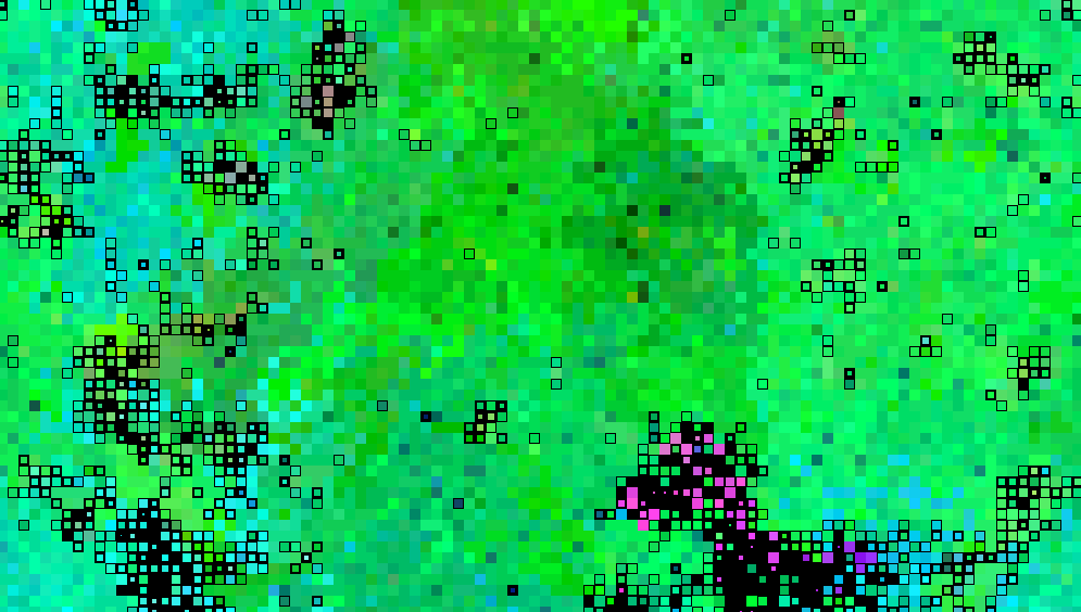 There is a single environment, a 50*50 grid which wraps around the sides. Every square on the grid can hold one cell. Every cell has 3 genes: speed, diet and power. Each gene does one thing only and is expressed by one base color (red, green and blue). This way, the mixed rgb color of the cell tells you exactly what its genes are.