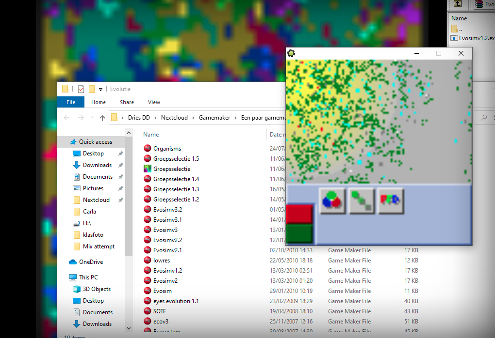 I started making evolution simulators based on my casual interest in evolution and ecology, without knowing what else is out there. It's one of those ideas where many people do sort of the same thing without knowing about eachother. As a teenager, I made my simulations in a tool called Game Maker, which was a lot of fun. I made one simulation for optimal eye placement on some swimming circle creatures, one for group selection and social behavior, and a few with the goal of creating lush ecosystems.